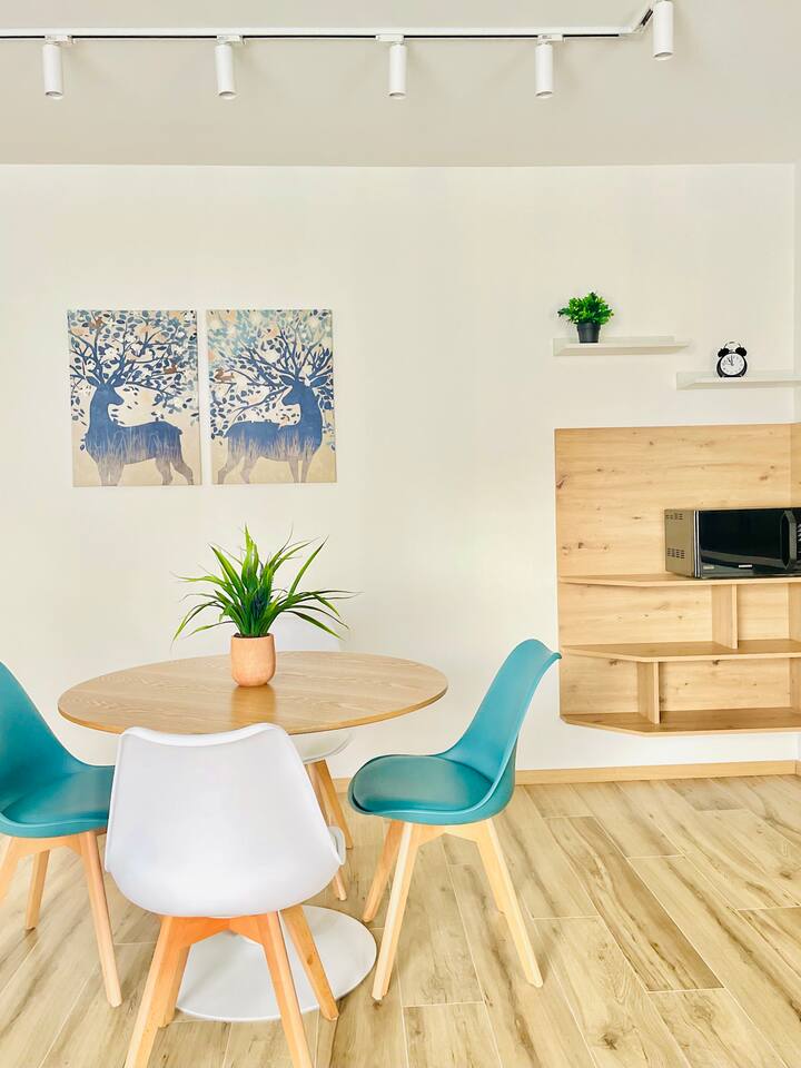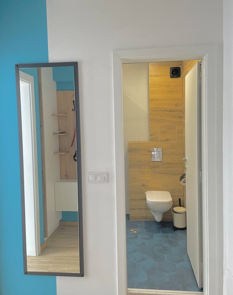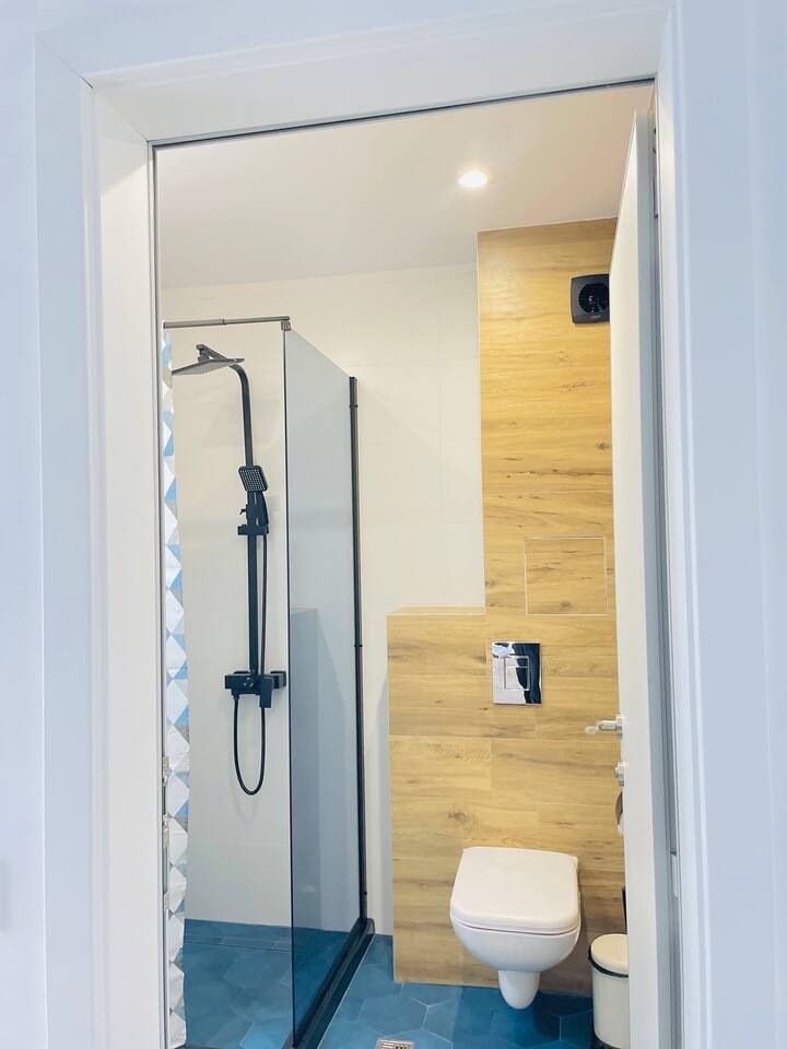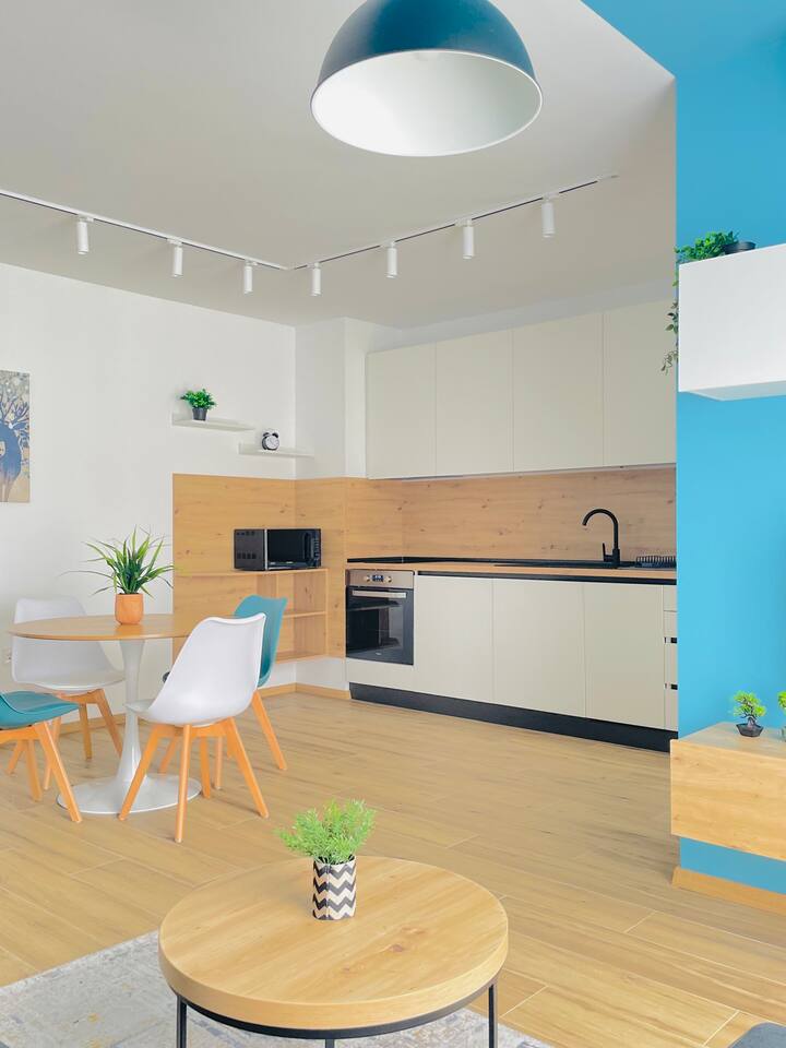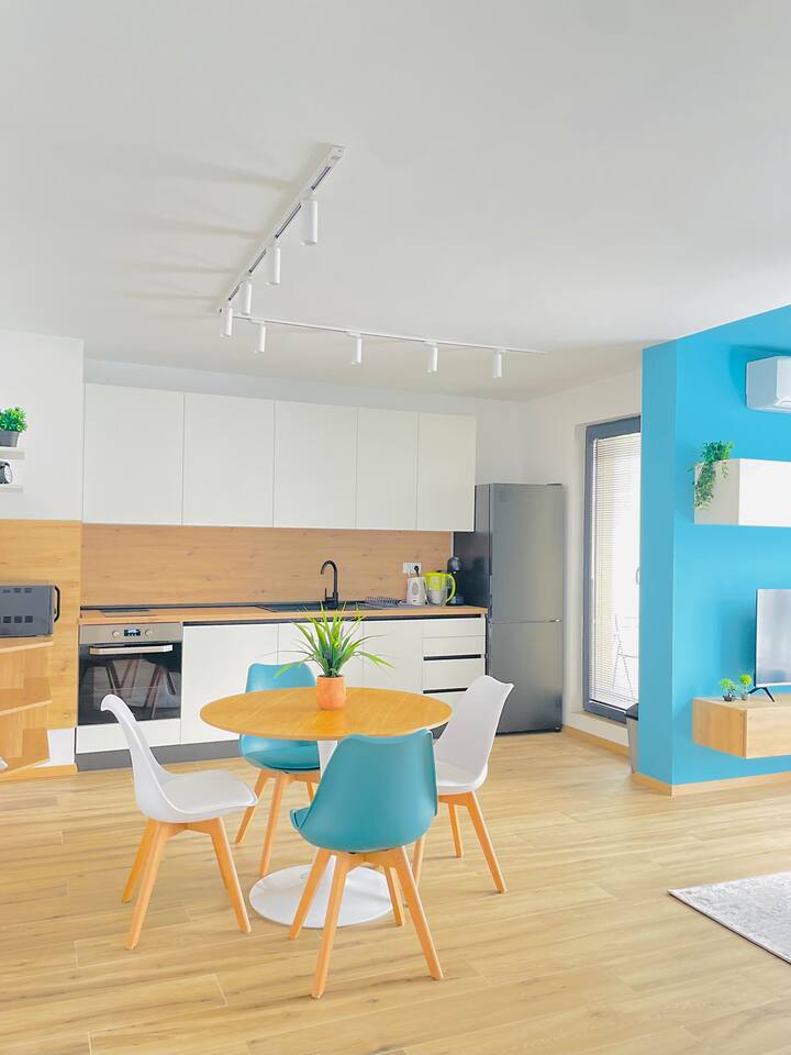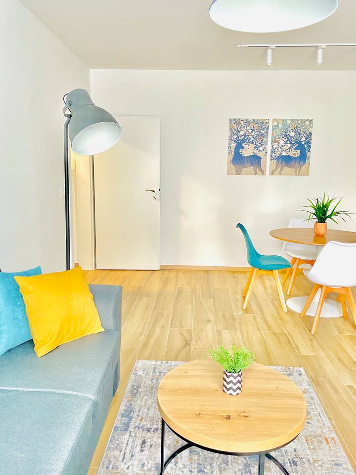 The apartment is in a newly constructed building with a modern, stylish design for ultimate comfort. In a quiet location with easy access to public transportation. The apartment features a bedroom with a high-quality mattress, a fully equipped kitchen with a washing machine and dishwasher, a spacious living room, a cozy dining area, and a pristine bathroom. You can also find a listing for the adjacent apartment, which looks the same, on our profile
